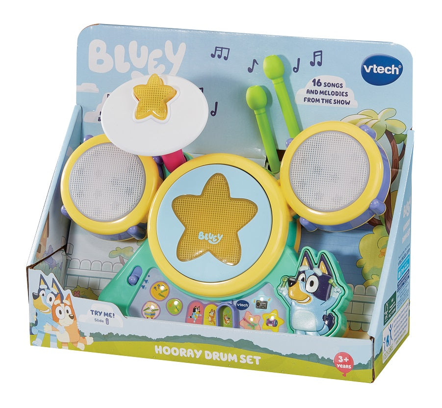 Drum up fun with Bluey! Play along to favourite tunes from the show in different music styles or have a drum solo with acoustic, electronic, silly or animal sounds and effects.