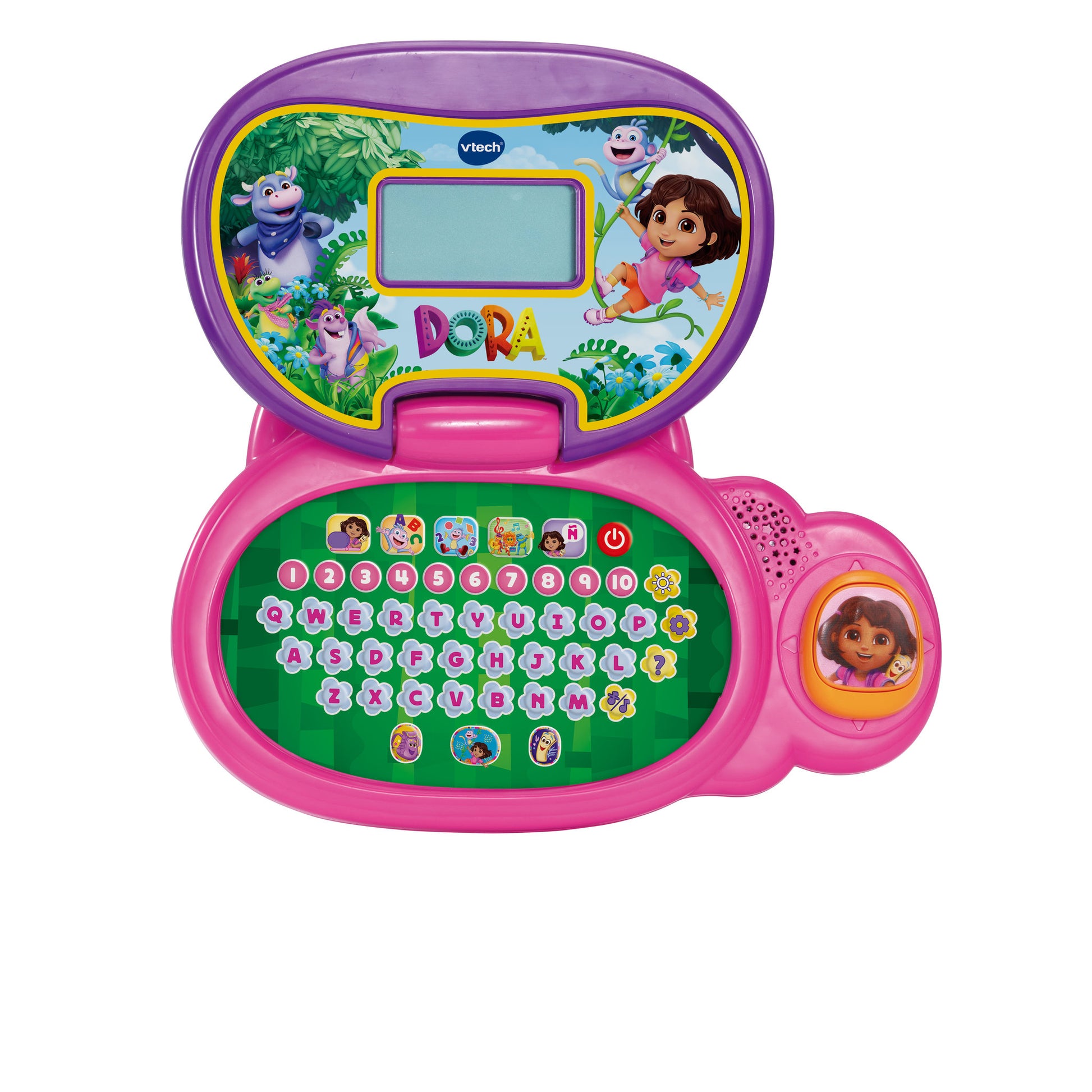 Get ready to learn some Spanish by exploring and learning with Dora - Enjoy 12 fun learning activities in total, with 5-character buttons. Features a full QWERTY keyboard with 26 letter buttons and 10 number buttons. See engaging animations on the backlit LCD screen which reinforce learning. Exciting light effects accompany the learning journey, to make each activity even more fun! Let's explore and learn!
