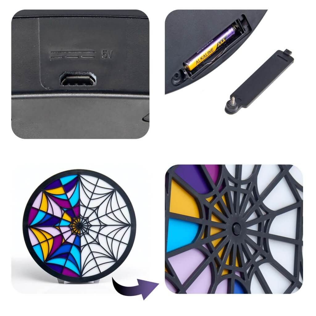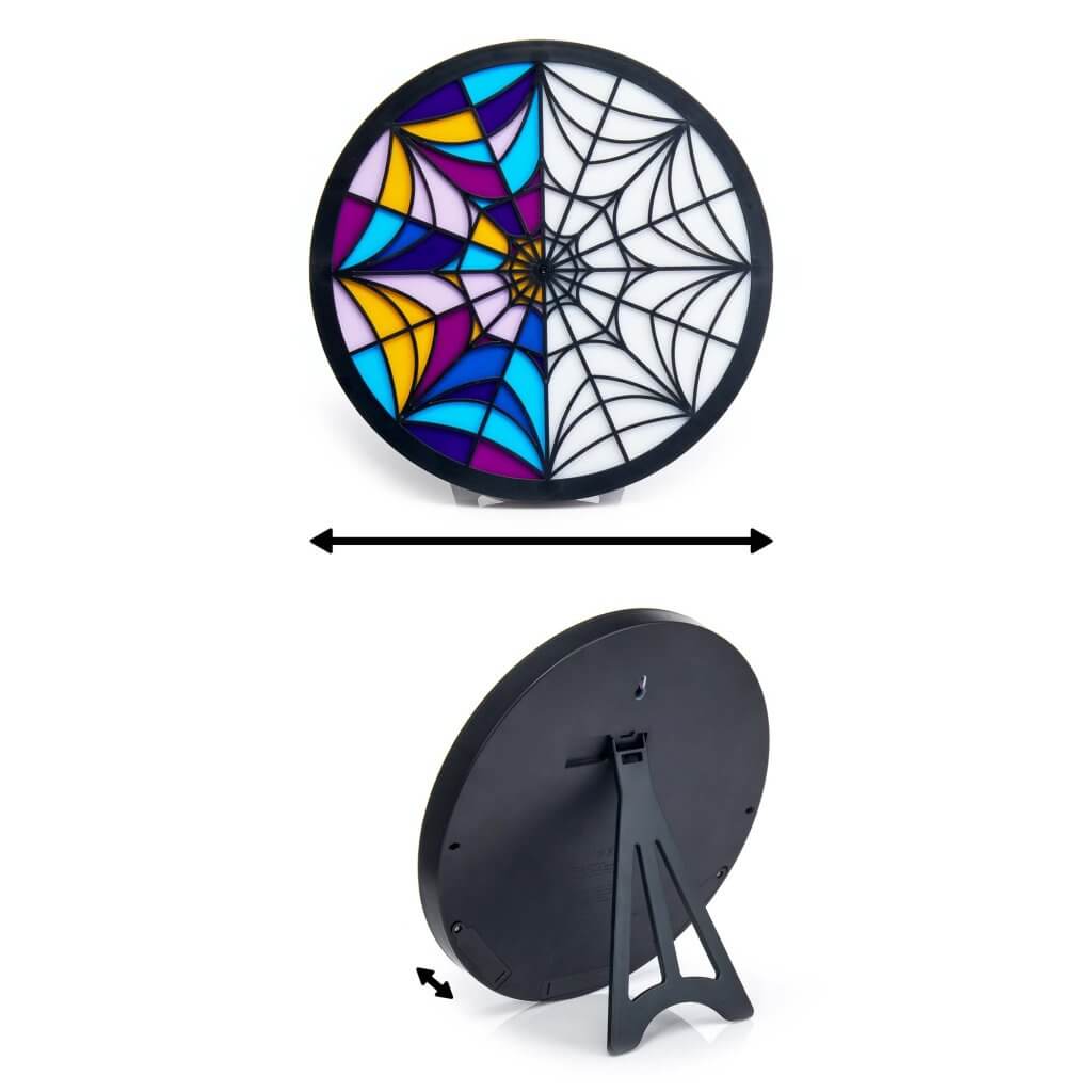 MULTI-LIGHT MODES- Use the secret button to scroll through 4 light modes. 1. Illuminate either Enid’s side or 2. Wednesday’s side of the window 3. Illuminate both sides. 4. Softly pulsating light across both side’s, Enid’s and Wednesday’s!
