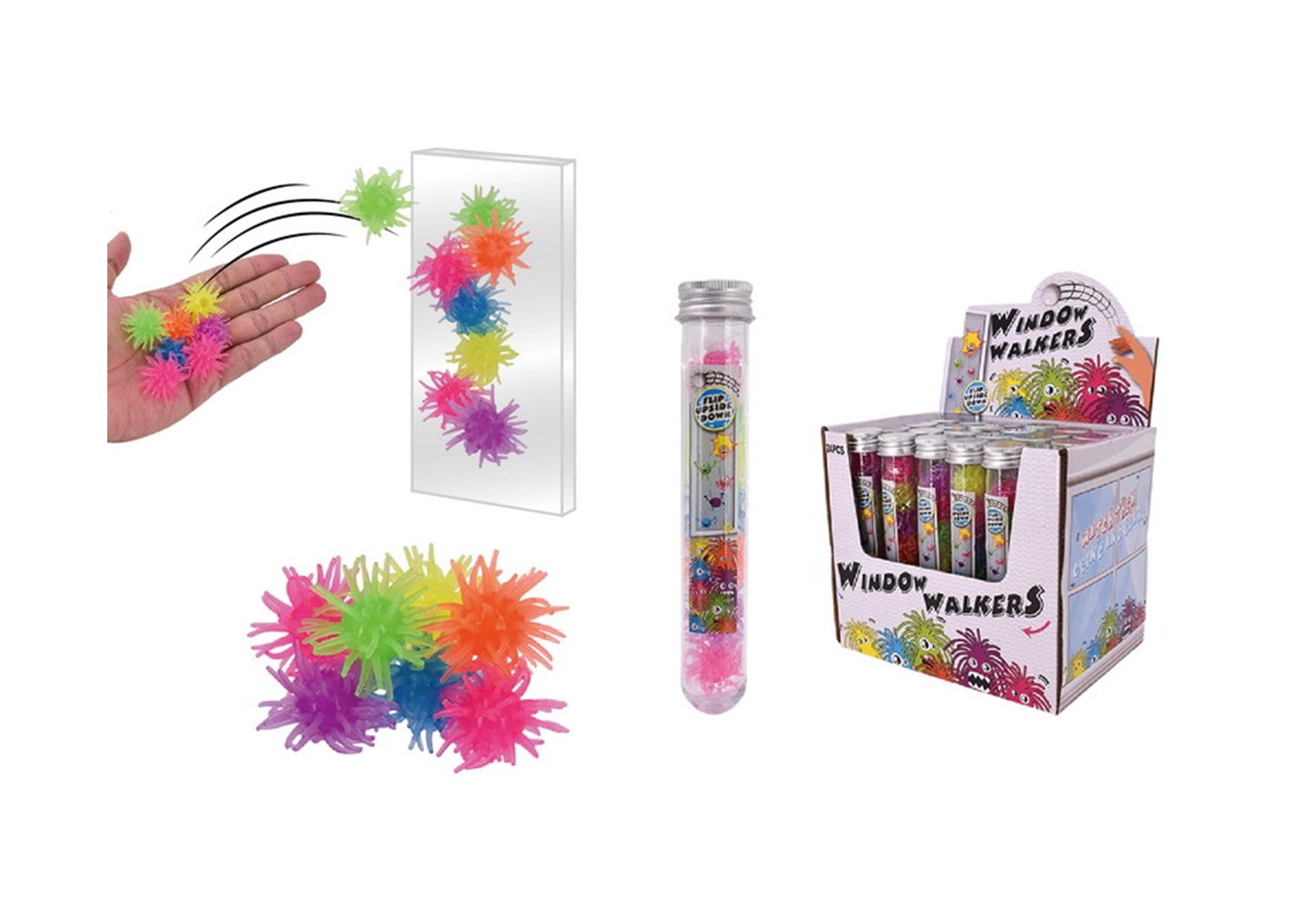 Keep kids entertained for hours with these awesome, colourful window walkers. Throw them and watch as they cling and climb up the wall. Hold them under the tap to make them sticky and let's play. Stored in tubes, this toy is perfect for kids to take on the go and show their friends.