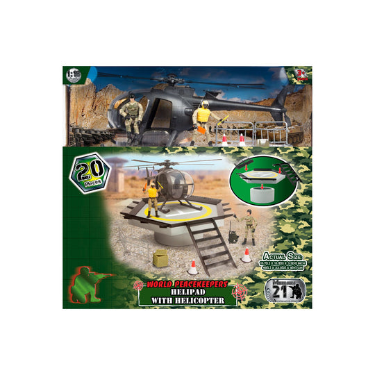 Includes helicopter, helipad, accessories and two figures. 20 pieces. Size 40(l) 33.5(d) x 9(h)cm. 3+