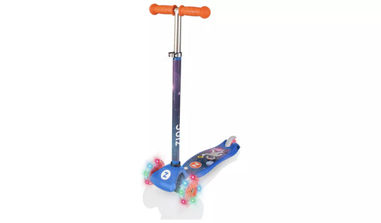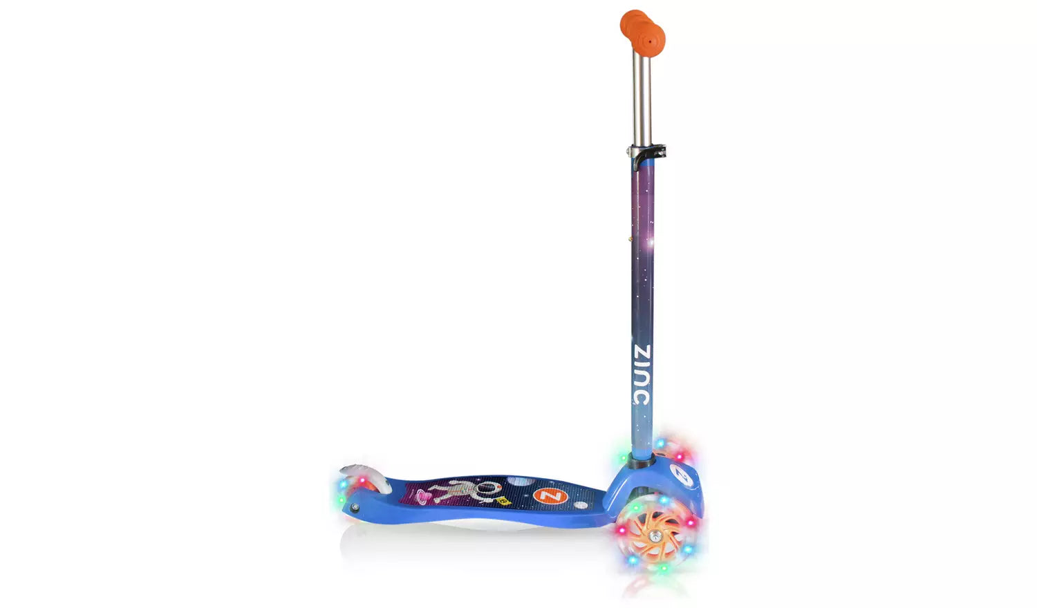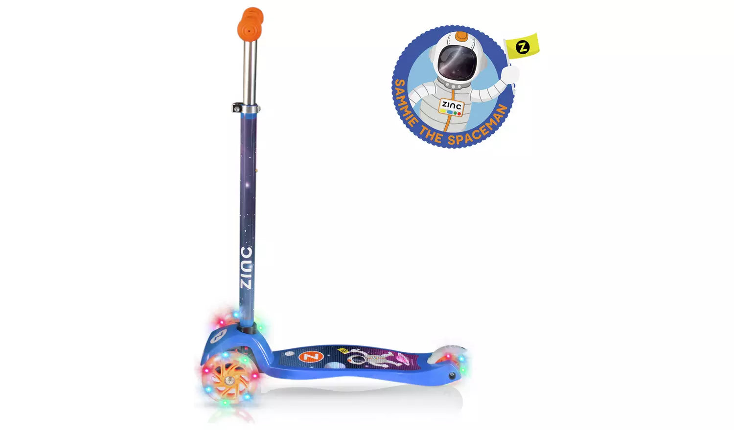 The Zinc three wheeled- Spaceman scooter is perfectly designed as a child's first scooter so that they can have fun whilst they safely learn to ride. Watch your child's face light up as they ride along with a flashing deck and battery free light up wheels!