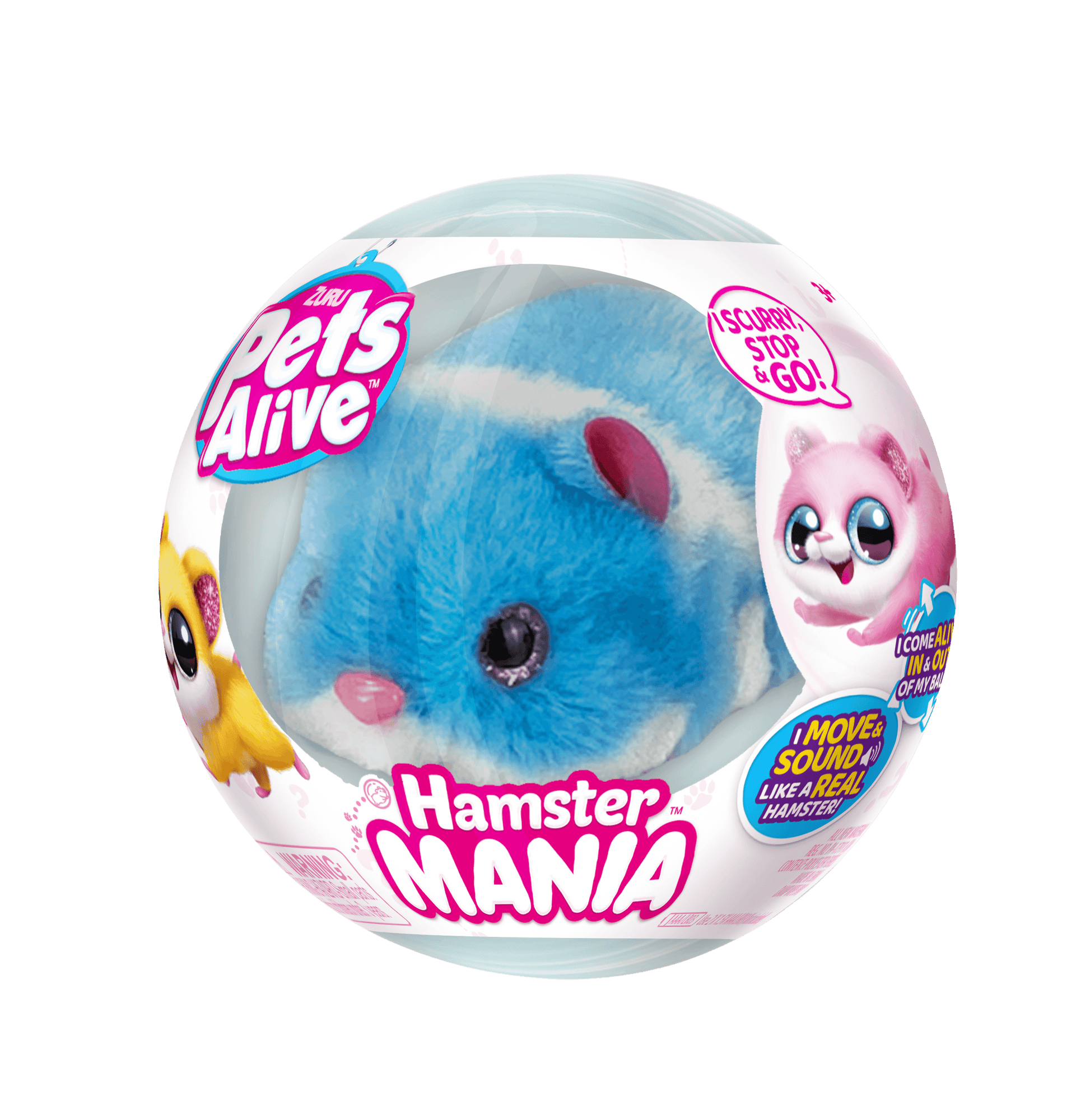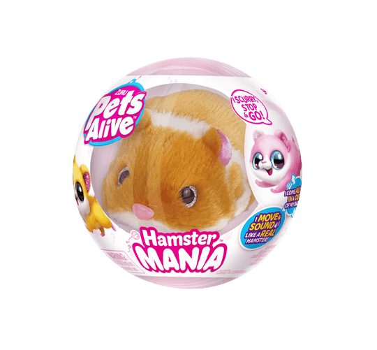 Meet the cutest bundles of fun with Pets Alive Hamster Mania! These furry friends run in and out of their balls and come to life with the sweetest hamster sounds! Hamster Mania are life like hamster pets, they can even sense walls and doors when they're scurrying around! There are 4 adorable Hamsters to adopt and collect for the ultimate Hamster Mania!