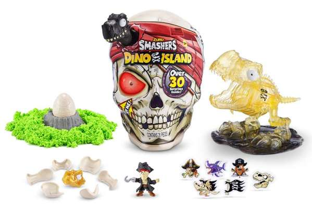 Smash your way to an epic prehistoric adventure with Smashers Dino Island Giant Skull. SMASH your skull to smithereens to uncover the 30 hidden surprises inside this action-packed skull! Search through cotton candy foam and super stretchy slime for your dino pieces! Along the way, look out for a pesky pirate figurine and 5 epic smashers mini eggs that hold all new mini characters!