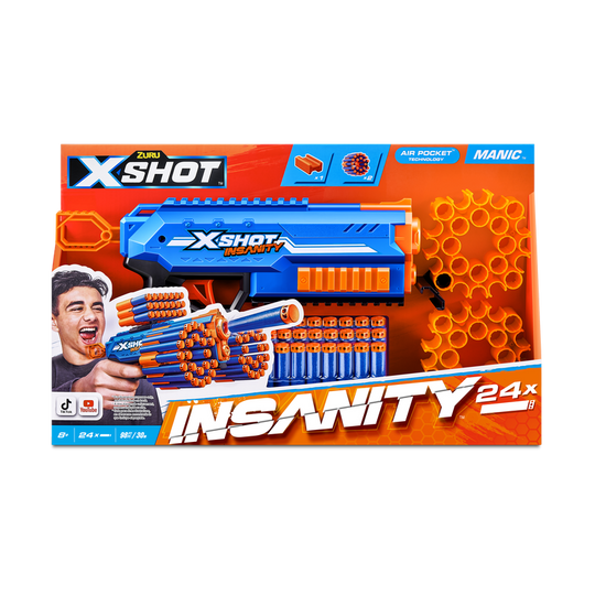 Insane combos, ammo and action with X-Shot Insanity! Jump straight into action with the X-Shot Insanity Manic Blaster. With a single dart capacity and dart storage for an additional 46 darts, you'll never be left empty mid battle. The easy to reload mechanism means you’re always be prepared and ready to fire. The Manic can hit targets up to 27m / 90 feet away. X-Shot darts include Air Pocket Technology for a faster, further, and more accurate blast. Combine the Manic with other Insanity blasters to make the most insane blaster!