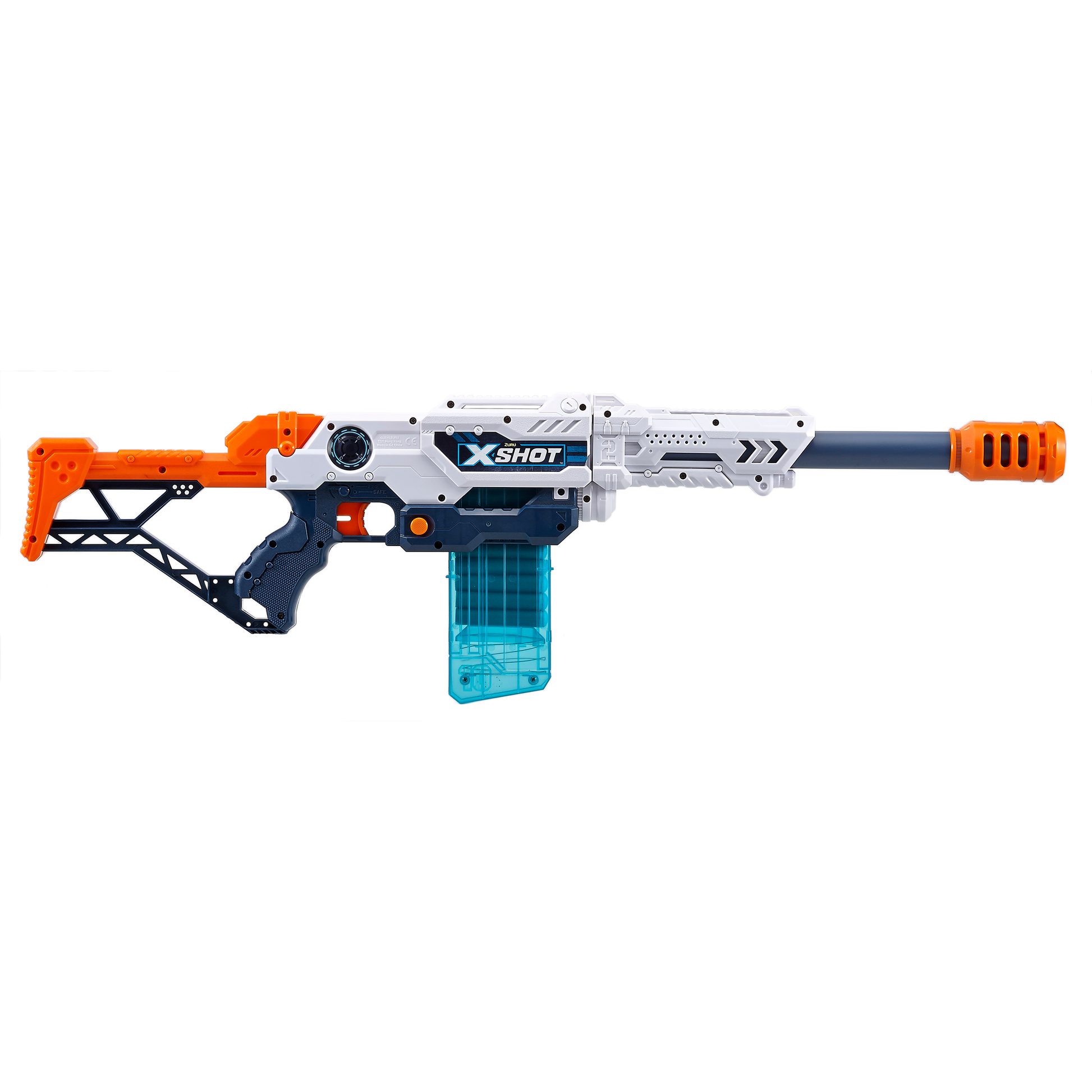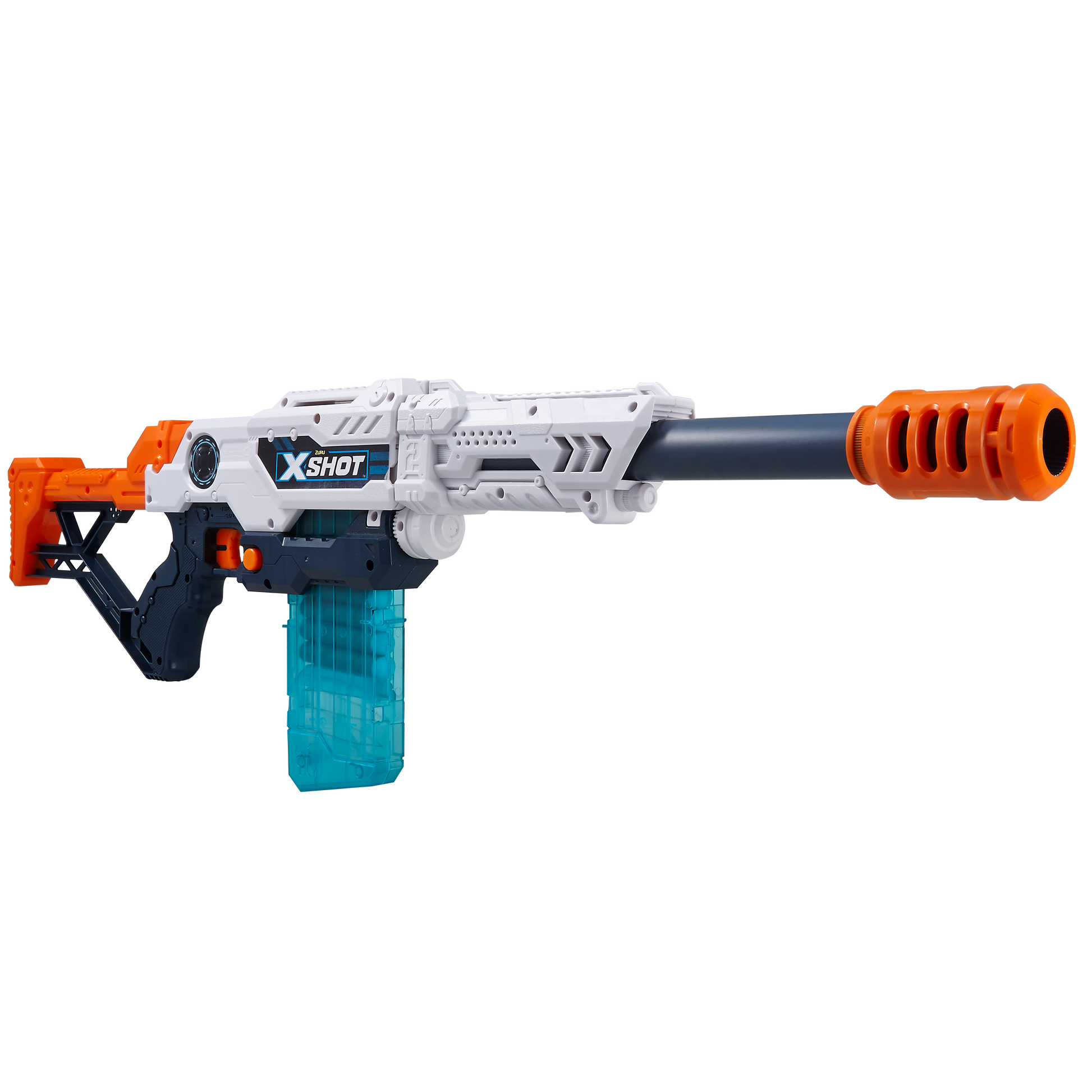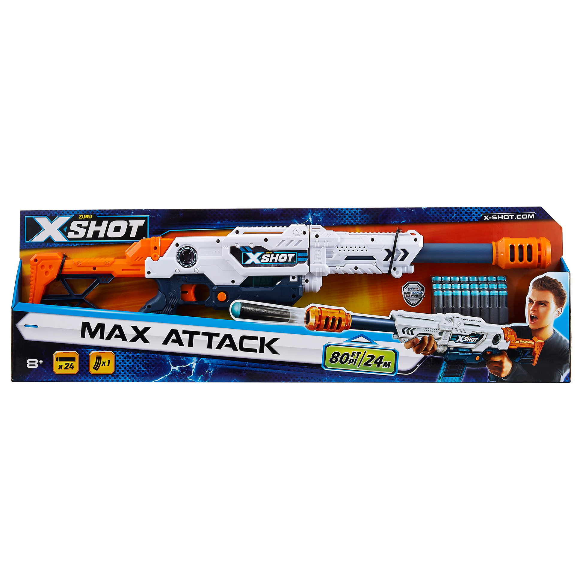 The X-Shot Max Attack is a clip blaster that allows you to shoot 10 darts up to 24 meters / 80 feet in a quick succession without reloading! When you?re out of ammo getting back into action is simple: release the dart clip fill with darts reload and blast! 8+
